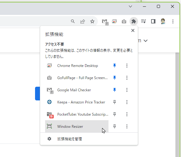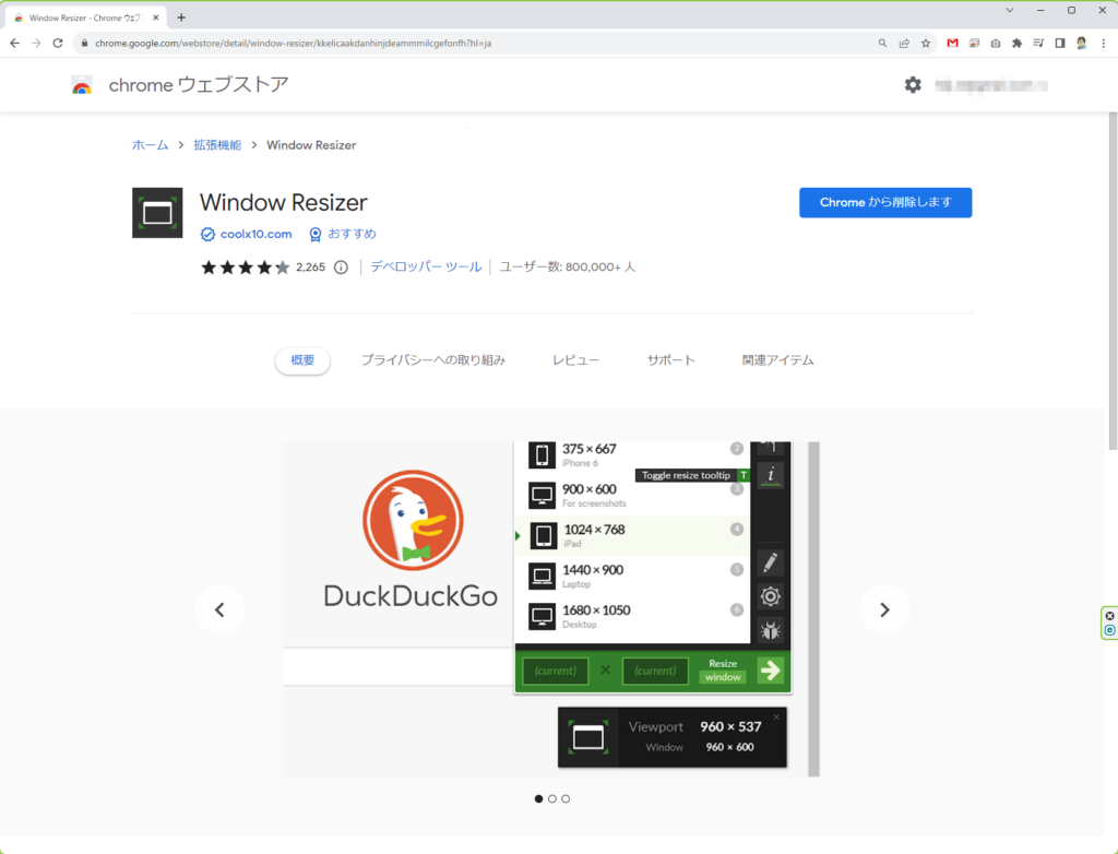 「Window Resizer」という拡張機能があったので、さっそくインストールして使ってみた。