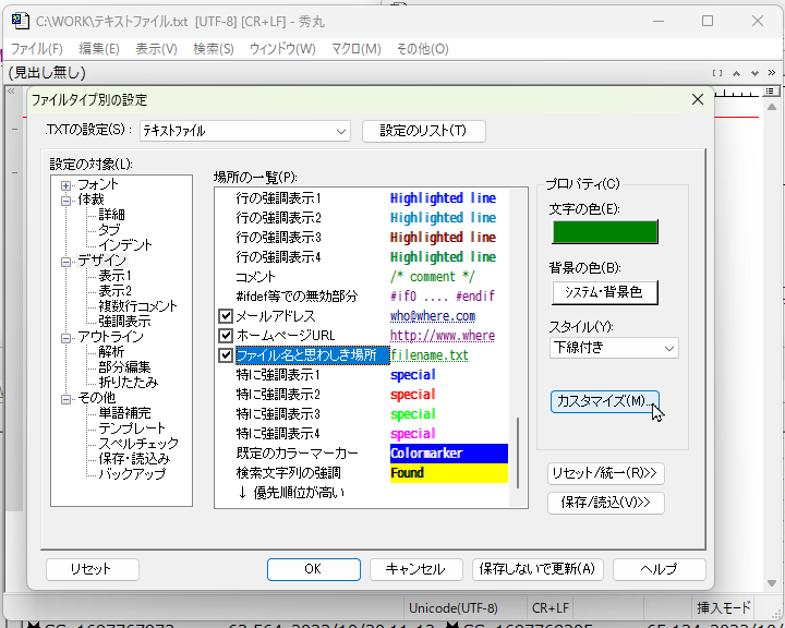 上記の設定で、全ての行で下線が引かれ、すべてファイル名だと認識されました。