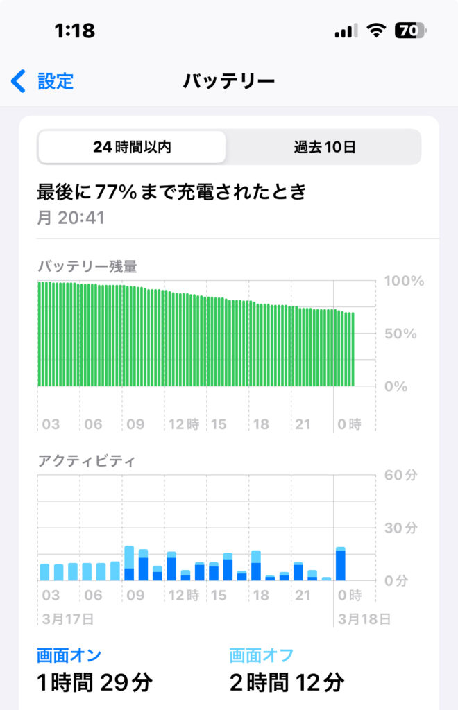 朝、100%に充電して特にアプリを使い込んだりしてないと、夜遅くになっても残バッテリーは70%の表示。(よく見たら20時間くらい使ってた!)