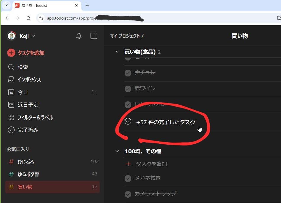 再度ブラウザを起動してTodoistのページに移動し、先程エラーだった「+○○件の完了したタスク」をクリックすると、問題なく表示されるようになった!