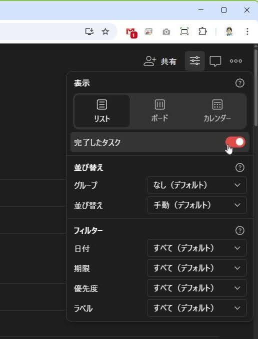 Todoistの[表示]メニューから[完了したタスク]をオンにすると、過去にチェックした項目が取り消し線付きで表示される。